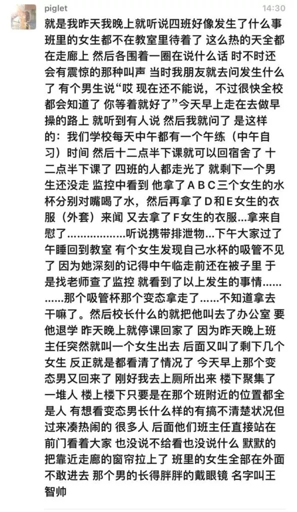 广东佛山三水华侨中学王智帅偷喝女生水杯用衣物打飞机