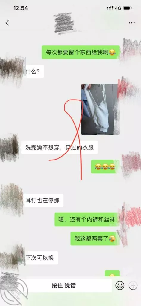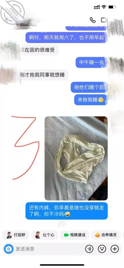 虽然过程有点坎坷,不过好在结果还好,之前不是说到约好了晚上一起到我家吃饭嘛,那自然是少不了酒的,毕竟喝了酒好办事嘛。因为我发小这几天刚好在我所在的城市出差,陪完领导来我家找我,我又跟发小一起喝上了,结果这就把我给喝多了……然后中途女邻居说困先回去,这下我就慌了,好在最终软磨硬泡,连哄带骗的又给弄回来了。不过说什么也不给我录视频,事先准备好的验证纸条也没用上,中间软磨硬泡,连哄带骗的聊天记录就不发了,喝醉了说的话太磨叽,就不给大家看了,下面几张图是睡醒后给他发的消息,晚上拍的照片,不给录视频,照片总要拍几张,哈哈哈,落在我家的内裤和丝袜,早晨他居然是短裙真空回去的,想想好刺激啊哈哈!有没有那种有特殊癖好的兄弟们,给你们寄过去,这个大扔子给大家欣赏一下,真的好大,