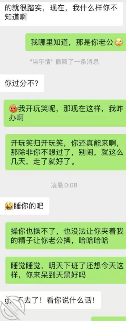 兄弟们,我最担心的事情还是发生了,昨天她老公回来了,这老兄也真逗的,我如果没记错她应该又快来大姨妈了,上次回来也是赶上来姨妈;今天也不知道是咋的了,到底是吵架了,还是就单纯的看着烦,问了也没跟我说具体的,反正所以就有了以下的聊天记录,哎,大家自己看吧,我现在真的是愁得很:兄弟们,虽然这个话题是略过了,但是我现在依旧还是很担心,女人这个东西吧,我是比较了解的,对于她们而言,尤其这种良家女,基本没有单纯身体出轨这一说,一定是身心一起的;虽然说是逗我的,但我不太相信,她一定是有这个想法,最起码是在那一瞬间是有这个想法了,而且还会纠结了很久才会发那条消息给我;说真的,这是我最担心的事情,我是不可能跟她过的,这点我很确信,首先我不想为了一棵小草放弃整片森林,我现在完全不想再有束缚,再有,我如果希望有个完整的家庭,那我肯定首选跟前妻复婚,再然后,我就算复不了婚,我大概率也不会去找个离婚的女人,