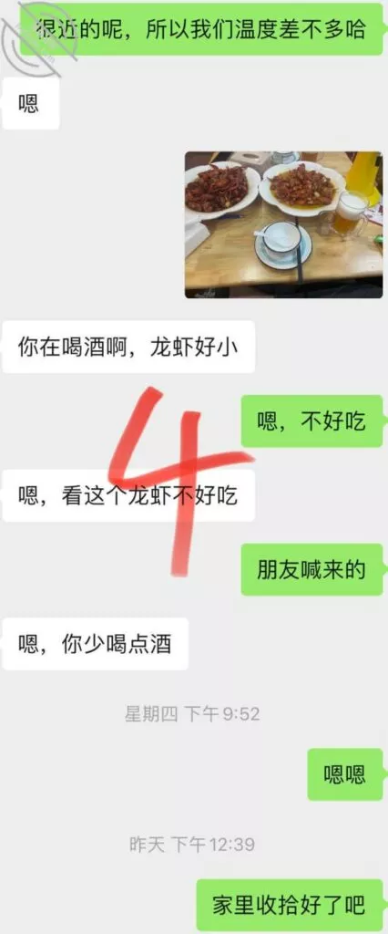 我看到留言也有朋友们在期待番外篇,我要跟大家说,既然伤好了,我肯定不会闲着,比如今晚就约了个妹子,不过能不能录视频,就太难说了,我约的都是良家女,就Cao个一两次的话,很难能让录视频,我以前也尝试过,不像这个少妇,这是我们Cao了很多次了以后才让我录,而且现在我录的多了她也都习惯了,不过呢,我会尽力而为哈哈;言归正传吧,我这些天一直都在拼命的训练她自己主动来,因为从我俩认识,每次Cao她都是我主动,我不太喜欢这种,我喜欢女人主动的,像个荡妇那样才爽;附上一部分聊天记录,这些日子,无论是平时日常交流还是微信聊天,我一直在强调这个事情,我喜欢被人Cao那种感觉,昨天晚上的照片,也不知道抽什么风,非要跟我出去吃,说从认识到现在就第一次见面在外面吃过一顿饭,然后就没有了,都是在家里,所以昨天硬拉着我出去吃的,还必须她请客,拗不过他,就附近随便找了个店(不过这家店真垃圾,龙虾好小,再也不去了);回家的时候已经很晚了,洗好澡躺床上以后,可能是这几天的说服教育起到效果了,