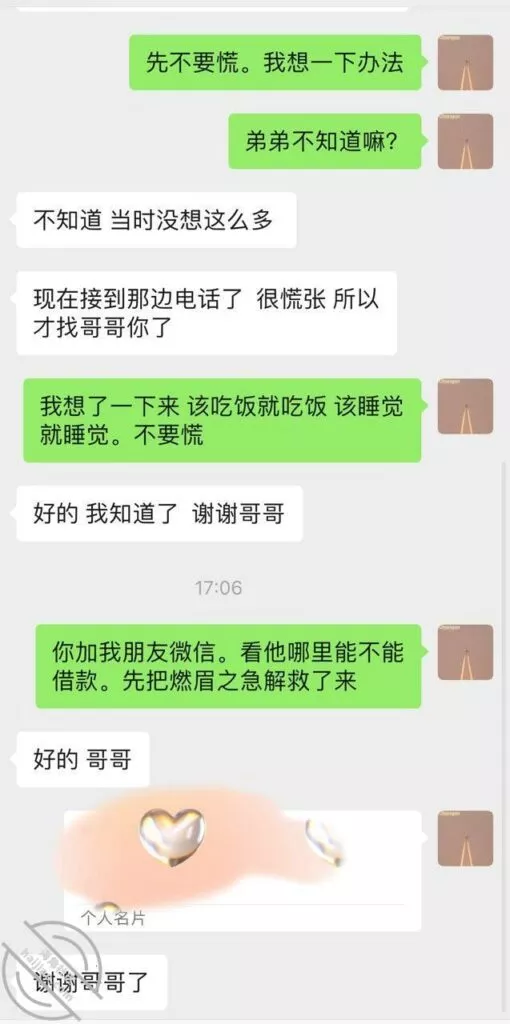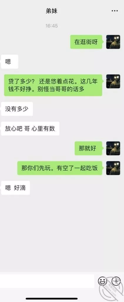 我不可能告诉她是果贷,只是说自己认识的这个人门路多,问问他或许能有什么办法,最后在假言相劝地付出几句“忠告”,让他远离网贷,更要远离高炮,当初是让你们借一点应应急,怎么能借这么多钱呢?