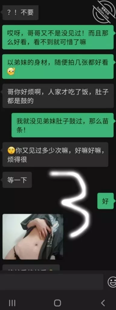 果不其然被我言中了,弟妹这边还有别的瞒着我的坑,她主动联系了我的小号,可能是之前的几千块得来的太过容易,俗话说有了第一次就会有无数次,放下了心里的坎弟妹也算食髓知味尝到了甜头。看弟妹这个架势,基本上就是背着老弟准备自己出来陪一次了,单线联系建立后就是如此轻松,女人如果有其他人架着就会特别在乎面子,当她自己一个人的时候反倒非常好说话。