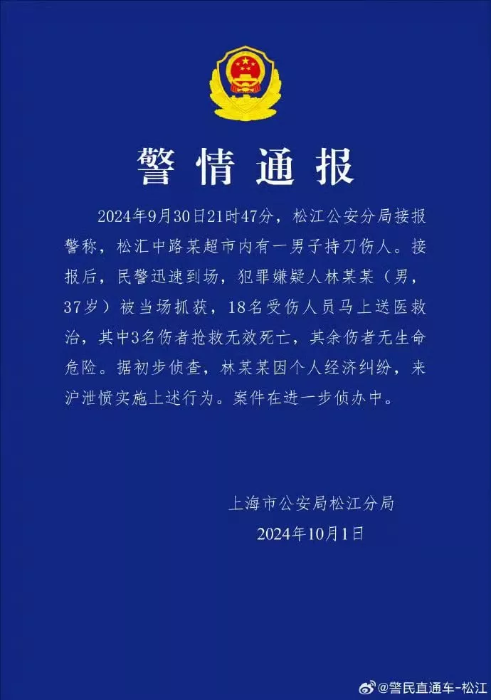上海松江沃尔玛发生持刀伤人事件的视频引发广泛关注。官方通报显示,事件已导致3人不幸遇难,另有15人受到不同程度的伤害。警方初步调查得知,嫌疑人是一名37岁的男性,作案原因是因个人经济纠纷而携带利器前来发泄不满。